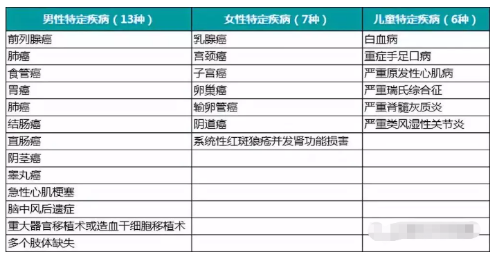 4.新增的特定疾病保障:增加13種男性疾病、7女性疾病、6種兒童疾病,如果是特定疾病發(fā)生,額外賠付30%的保額,即假設500,000保額,如果體重發(fā)生疾病是特定的,賠付是650,000。