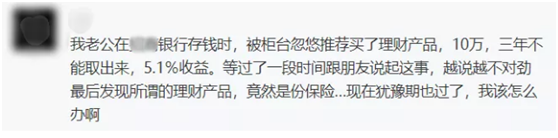 可能很多人都遇到這樣的情況,去銀行存款,然后工作人員介紹,產(chǎn)品受益如何好,收益能達(dá)百分之五點(diǎn)多,而且還有人身保障,乍一聽上去不錯,有些人就迷迷糊糊購買了,結(jié)果后來才發(fā)現(xiàn)原來是保險,比如王女士的例子: