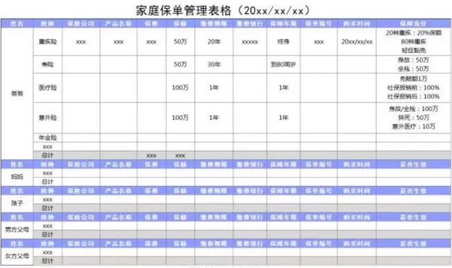 用這樣一張表格,我們可以清楚簡(jiǎn)潔地看到,家庭成員的保障情況,誰(shuí)還缺什么險(xiǎn)種,誰(shuí)的保額不足等等,都非常明朗。通過保費(fèi)總計(jì)來(lái)調(diào)整自己的預(yù)算,通過保額來(lái)判斷自己是否還需要再加保等,一張表格就能掌握全家的投保情況,是非常方便的。