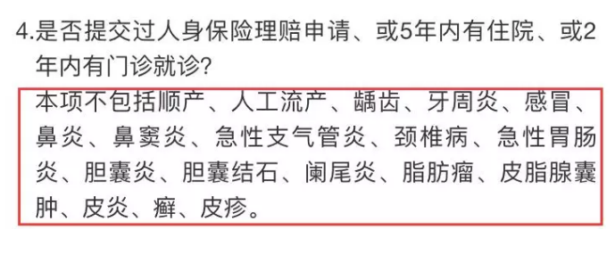 哆啦A保重疾險也對理賠申請進行了詢問,不過對于一些小疾病的理賠是不包含在內(nèi)的。同時它對2年內(nèi)的門診就診也有詢問,所以如果是2年內(nèi)有過門診治療,即使沒用門診險報銷,也算在內(nèi)。