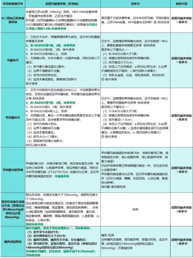 并且甲狀腺結(jié)節(jié)、乳腺結(jié)節(jié)1-2級(jí)可標(biāo)體承保,乙肝小三陽(yáng)、高血壓、痛風(fēng)和甲減等滿足條件也是可以標(biāo)準(zhǔn)體承保的。