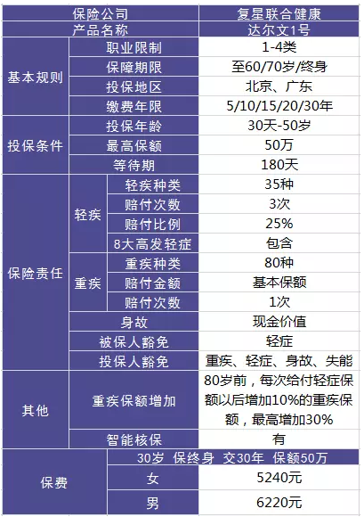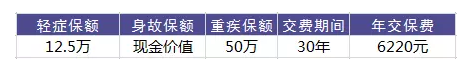 張先生今年30周歲,購(gòu)買達(dá)爾文1號(hào),重疾保險(xiǎn)金額50萬(wàn)元,輕癥疾病保險(xiǎn)金額12.5萬(wàn)元,交30年,保險(xiǎn)期間保至終身,每年繳納保費(fèi)6220元。