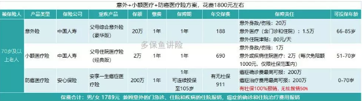方案③:70歲以上的老人,意外+小額醫(yī)療+防癌醫(yī)療險方案,花費(fèi)1800元左右