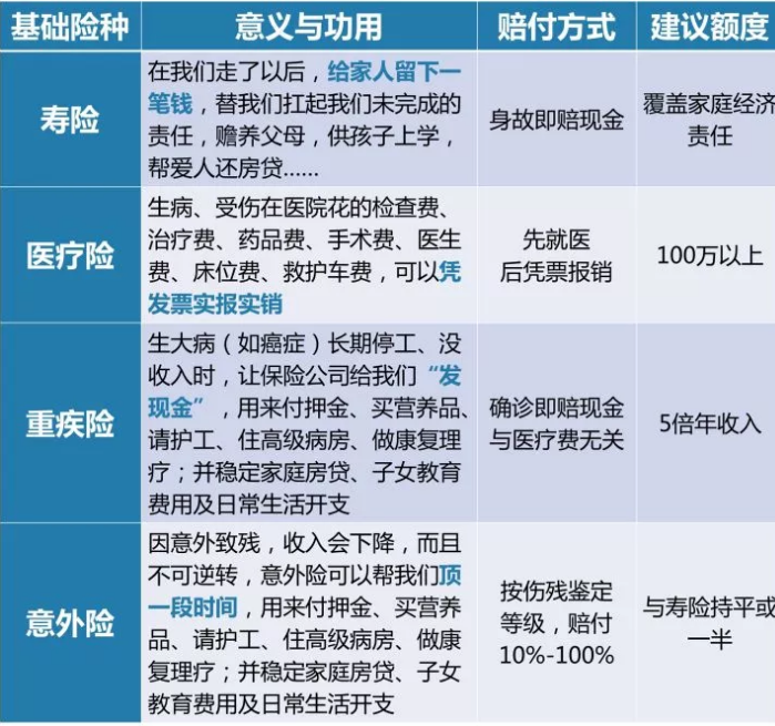 買保險(xiǎn),首先要搞清楚保險(xiǎn)都有哪些類型,各自的作用是什么——壽險(xiǎn)、醫(yī)療險(xiǎn)、重疾險(xiǎn)和意外險(xiǎn)。如圖: