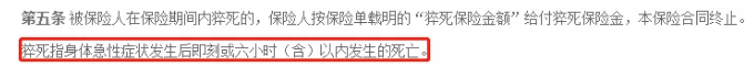 條款規(guī)定,只要在6個小時內發(fā)生的死亡都可以作為猝死來賠付。