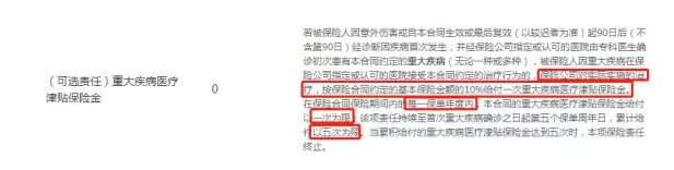 即:確診重疾后,在指定醫(yī)院治療的,每年給付一次額外10%基本保額的保險金,持續(xù)至確診日后的第5個保單日,累計給付5次。