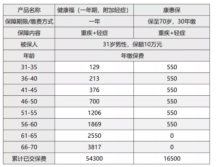 現(xiàn)在來看看直觀的對(duì)比,以下是健康福(一年期)和百年康惠保年繳保費(fèi)對(duì)比: