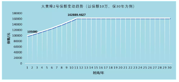 保額上看,大黃蜂、慧馨安、童樂保三個產(chǎn)品的保額為100,000-800,000,隨e保少兒版保額為5-40,000。這里要注意的重點(diǎn)是大黃蜂2號,其保額正在增長。隨著時間的推移,大黃蜂2號的保額可以達(dá)到基本保額的1.6倍。