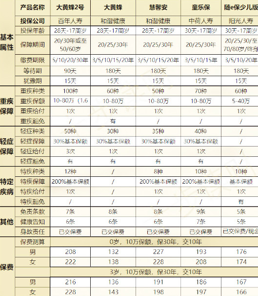 當(dāng)然,其他幾種產(chǎn)品也各有優(yōu)勢。如果預(yù)算有限,你可以考慮和諧健康的大黃蜂; 慧馨安有“8種兒童特定疾病,最大損失160萬”,這也是一個亮點(diǎn)。