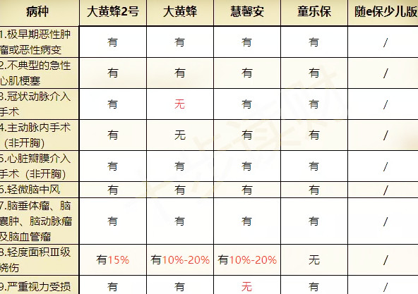 結(jié)論:大黃蜂2包含所有9種高風(fēng)險的輕癥,但與輕度區(qū)III級燒傷的其他產(chǎn)品不同。電子保護(hù)版沒有輕癥保障,其他三種產(chǎn)品差別不大。