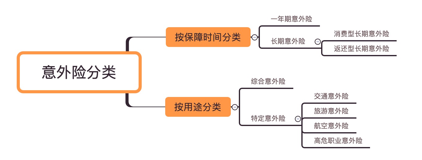 雖然意外險相比健康險不算復(fù)雜,但是意外險種類繁多,下圖從保障期限和用途對意外險做了簡單分類: