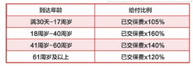 如果投保人30歲投保,不幸35歲身故,他交了10萬保費,那么保險公司按照160%的已交保費也就是16萬給付身故保險金。如果他不幸45歲身故,那么身故保險金為14萬。