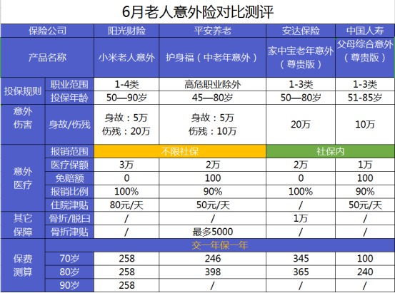 老年人由于年紀(jì)大了,腿腳不便,自我保護(hù)能力下降,而且容易因意外引發(fā)其它的并發(fā)癥。因此,意外傷害醫(yī)療額度對老人來說非常重要,并且意外傷害保險(xiǎn)和意外津貼可以提供有效的幫助。針對老年人的意外險(xiǎn),小編推薦以下4款產(chǎn)品: