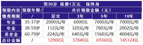 假設30歲的李先生投保該產品,每年交1萬元,保終身,保額3900元,79歲不幸發(fā)生身故的話,我們來看一下不同的交費期限,可以拿到多少錢。