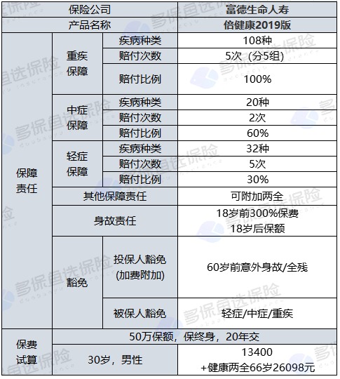 富德生命倍健康2019是富德生命人壽旗下的一款多次賠付型重疾險。共有兩個版本:基礎(chǔ)版(重疾險)和主險(重疾險)+附加險(兩全險)。