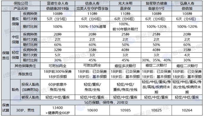 為了直觀的判斷倍健康2019,我們將倍健康2019和完美人生、嘉多保、備哆分1號和倍倍加的信息列在下表,我們按照50萬保額,20年繳費的情況來進行對比一下: