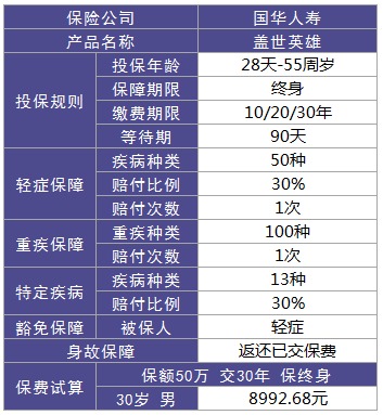 蓋世英雄是一款單次賠付保障終身的重疾險,重疾賠1次,輕癥賠1次,賠付基本保額的30%,男性特定疾病額外賠付30%??傮w來說,保障方面沒什么問題,保障性不錯。