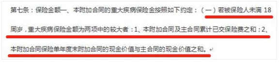 上邊的條款簡單來說就是:18歲之前得大病,不賠錢,只退保費(fèi)?。?!
