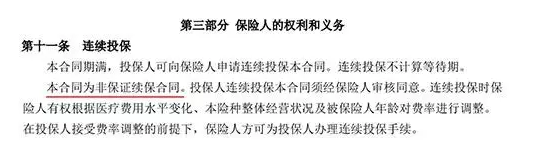 2.隔壁老王得了肺炎,愈合并且理賠,但仍有復發(fā),需要續(xù)保,但在提交申請時被拒絕。為什么?因為這個醫(yī)療保險不保證續(xù)保,讓我們來看看大多數(shù)醫(yī)療保險的續(xù)保條款內容: