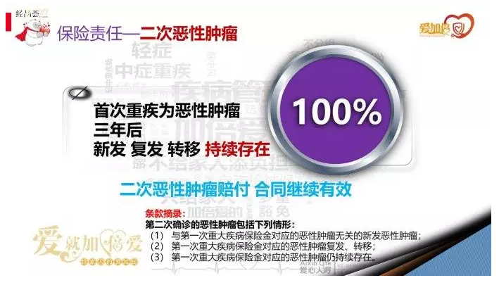 但是,經(jīng)過惡性腫瘤的治療后,有些人會(huì)發(fā)生轉(zhuǎn)移和復(fù)發(fā),其中大部分發(fā)生在根治性手術(shù)后80年內(nèi),約占80%;并且愛心人壽的愛加倍第一次惡性腫瘤和第二次惡性腫瘤的間隔時(shí)間僅為3年,包括新發(fā)惡性腫瘤、復(fù)發(fā)、轉(zhuǎn)移和持續(xù)性癌癥,這大大增加了賠付的幾率,真是一款很有誠意的保險(xiǎn)!
