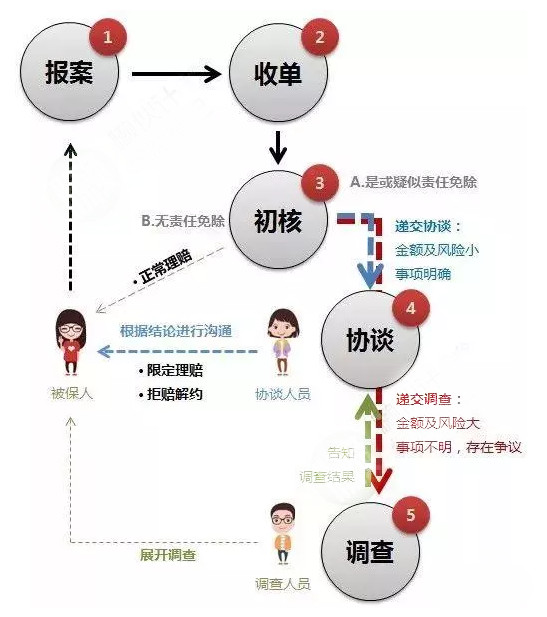協(xié)談人員會將與被保險人(申請人)進行溝通。在核實情況后,被保險人不會被轉(zhuǎn)移到議會的審查中,通知將不予賠償,并將予以賠償。如果被保險人有異議,會談將轉(zhuǎn)移到調(diào)查中,以進一步了解情況。
