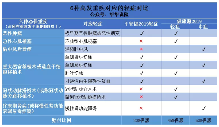 可以看出,覆蓋了與輕癥對(duì)應(yīng)的6種高發(fā)重疾,可以看出健康源2019的輕癥/中癥的保障更全面。