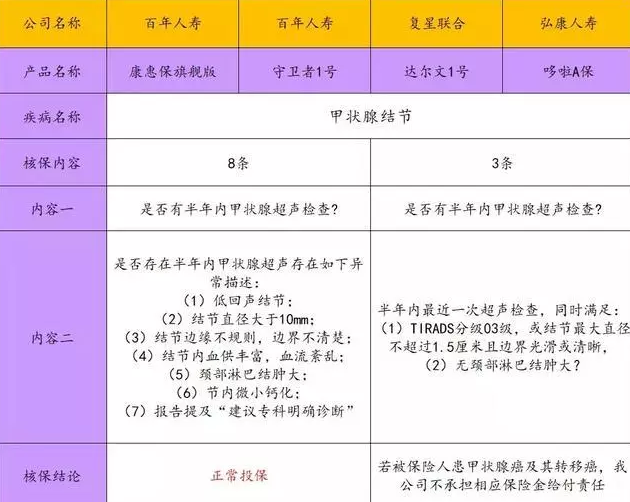 同一疾病公司的核保結(jié)論和核保的內(nèi)容也不一樣。下面我發(fā)現(xiàn)目前市場上出售的一些良好的健康風(fēng)險(xiǎn),以“甲狀腺結(jié)節(jié)”為例。要看誰的智能核保是最放松的。