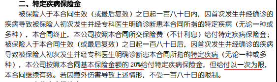 評論:該產(chǎn)品的輕癥由[特定疾病]的概念解釋,其實(shí)用[輕癥]概念更易于用戶理解。輕癥30種,支付1次,20%保證金額。輕癥的數(shù)量不是太小,但支付率太低。