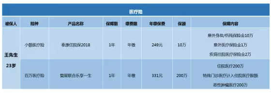 我們剛剛進(jìn)入社會(huì),可支配資金不足,不建議留下醫(yī)療風(fēng)險(xiǎn),并分配醫(yī)療保險(xiǎn)來轉(zhuǎn)移醫(yī)療風(fēng)險(xiǎn)。在醫(yī)療保險(xiǎn)方面,主要考慮因素是免賠額鯤報(bào)銷范圍和報(bào)銷比例。
