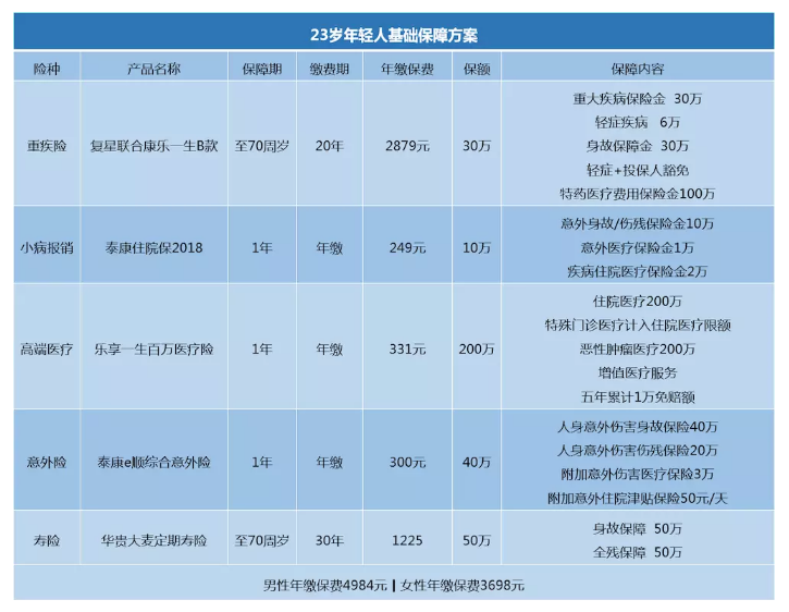 如果你二十幾歲且經(jīng)濟(jì)條件已經(jīng)穩(wěn)固,你可以增加保額鯤購買終身保障產(chǎn)品,甚至準(zhǔn)備退休保險(xiǎn)。例如,上面的基本計(jì)劃,危重病保障增加到50萬,壽險(xiǎn)配額增加到80萬,23歲男性支付保費(fèi)也不超過1萬元。