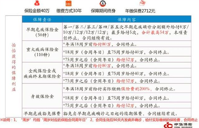 女嬰怡怡0歲投保40萬重大疾病保險(xiǎn),保障終身,30年付款,保險(xiǎn)費(fèi)用年2712元,獲得保障如下圖所示: