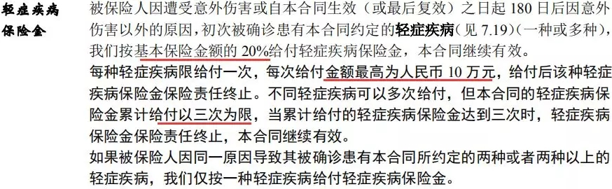 輕癥:30種,賠付3次,賠付20%基本保險(xiǎn)金額