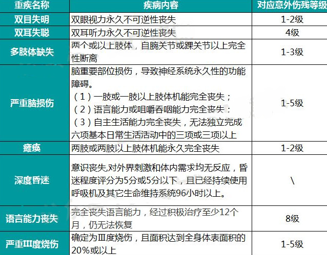 以下是與重疾部分對(duì)應(yīng)的意外傷殘等級(jí)??梢詤⒖家幌拢?/p>