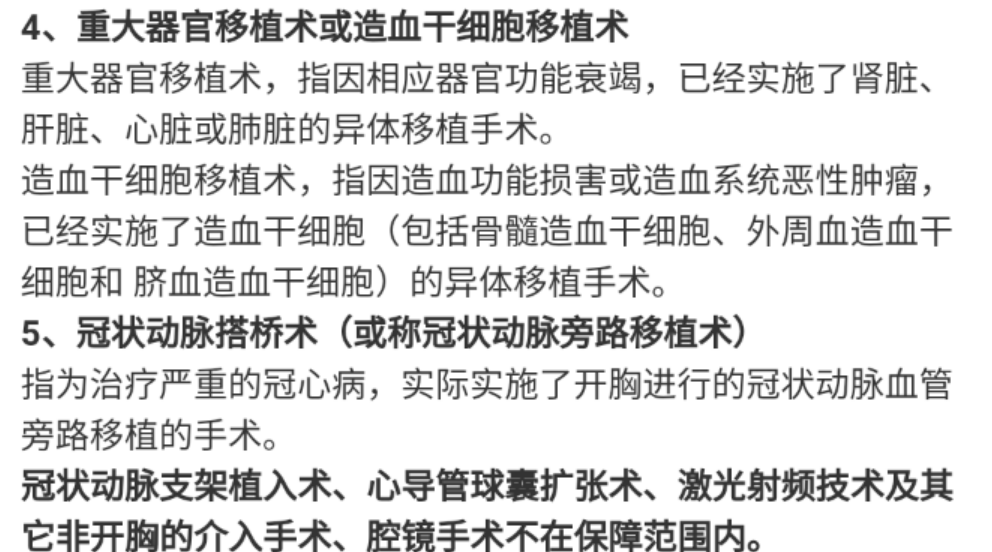 明確要求實(shí)施約定的手術(shù)并達(dá)到賠付狀態(tài)。常見的是重大器官移植,如肝臟、心臟、腎臟之類;或老年人冠狀動(dòng)搭橋手術(shù)。