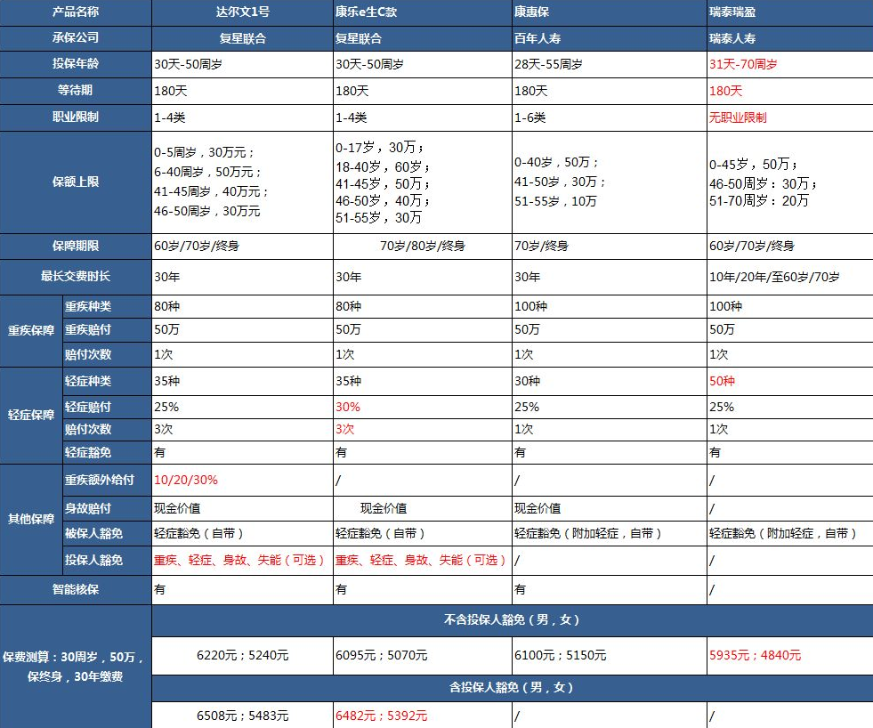 為了便于比較,多保魚把達爾文1號、百年康惠保、 瑞泰瑞盈和復(fù)星聯(lián)合康樂e生中進行了比較: