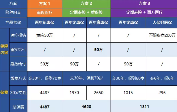 方案2:只要它是重疾,它一次可以賠付50 萬,身故可再賠 50 萬。相比之下,方案2的保障更全面,但保費會更貴一些。