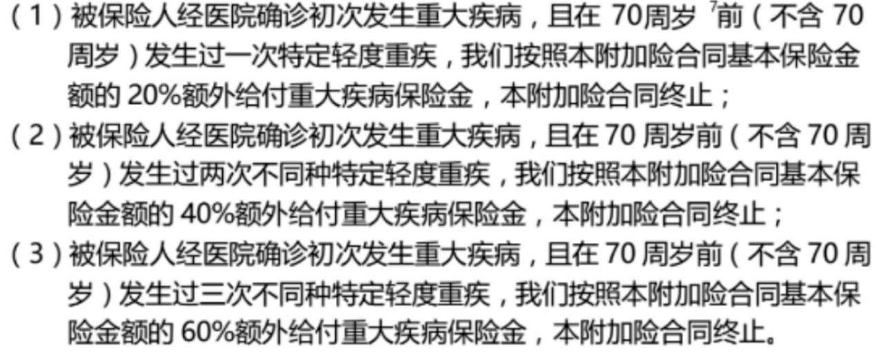 平安福的特點是,如果您在輕癥之后患有嚴(yán)重疾病,每種嚴(yán)重疾病的保額將增加20%: