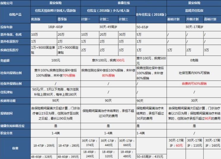 目前,線上有幾種小型醫(yī)療保險相對高質(zhì)量。他們分別是:易安住院無憂保障計劃、 泰康在線住院寶、 易安藍(lán)精靈住院保。對比圖如下: