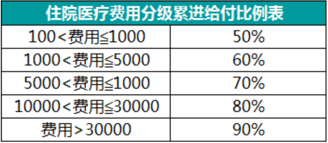 如果沒(méi)有社保報(bào)銷,或社保報(bào)銷不超過(guò)70%,那么它將采取累進(jìn)報(bào)銷的形式。不到1000元只能報(bào)銷50%,花的越多,報(bào)銷率越高,超過(guò)30,000的費(fèi)用可以報(bào)銷90%。具體的報(bào)銷方法如下: