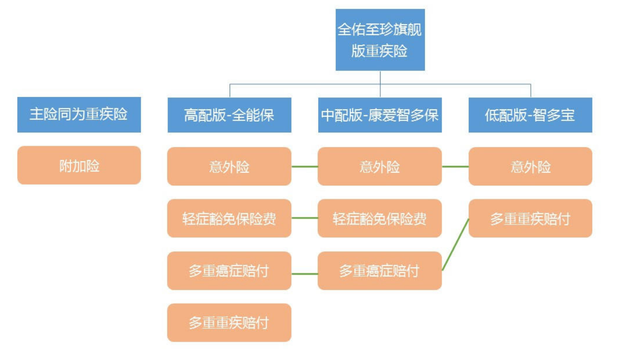 也就是說(shuō),主險(xiǎn)是重大疾病保險(xiǎn)的全佑至珍旗艦版其實(shí)共有三種產(chǎn)品:全佑至珍旗艦版康愛(ài)智多保計(jì)劃、全佑至珍旗艦版全能保計(jì)劃、全佑至珍旗艦版智多寶計(jì)劃康愛(ài)智多保的特征是輕癥豁免,以及多重癌癥賠付;而全能保的特點(diǎn)是添加了輕癥豁免、多重癌癥賠付、多重重疾病賠付,保障很“全能”。