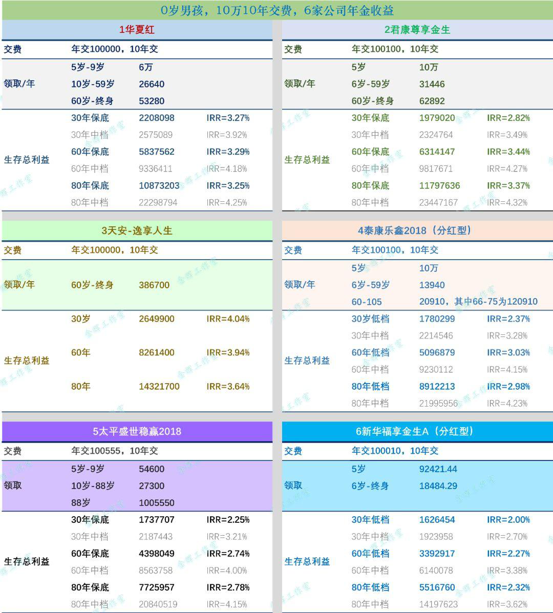 1、本文列舉6款產(chǎn)品,作分析,以0歲男孩,10年交每年10萬為例。