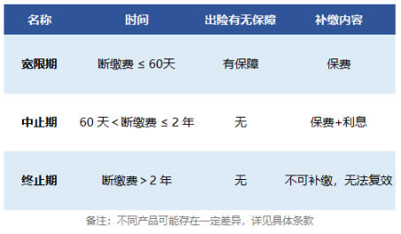 如果您在寬限期結(jié)束后未支付保費,你將不再享受保險。如果您確實忘記了付款,則可以在寬限期后的60天內(nèi)補交保費。