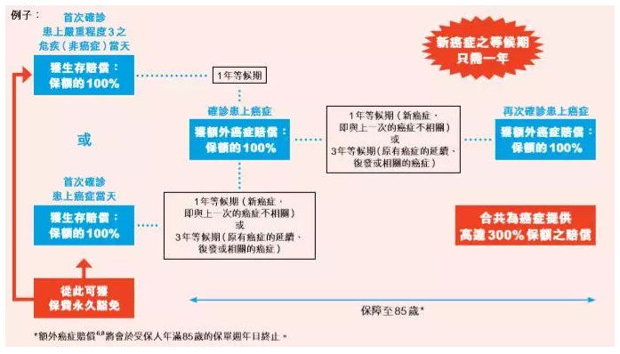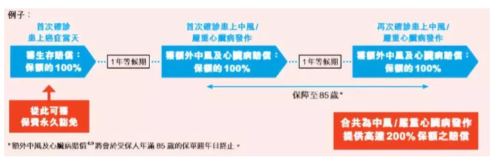 就首次因嚴(yán)重程度2或3之危疾已付或應(yīng)付生存賠償后,第一次從診斷日期開始的基本計劃的保費將永久為豁免,并且被保險人可以免費享受保障至保單終止。