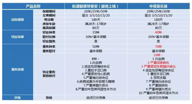 1.我們可以看出這兩個產(chǎn)品都在保障責任結構和基本信息如支付期,等待期,保障期等都是一樣的,中荷童樂保重疾種類 70例,輕癥40種,特定疾病10種都多過慧馨安。