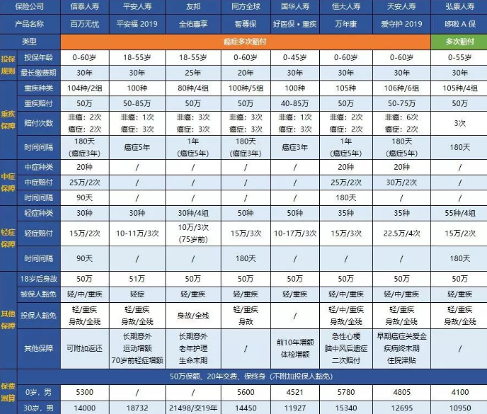 今天我為每個人找來了7個癌癥多次賠付產(chǎn)品,并添加了重疾多次賠付產(chǎn)品進行比較,它們分別是: