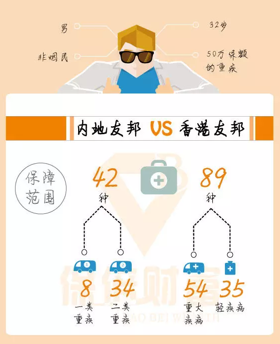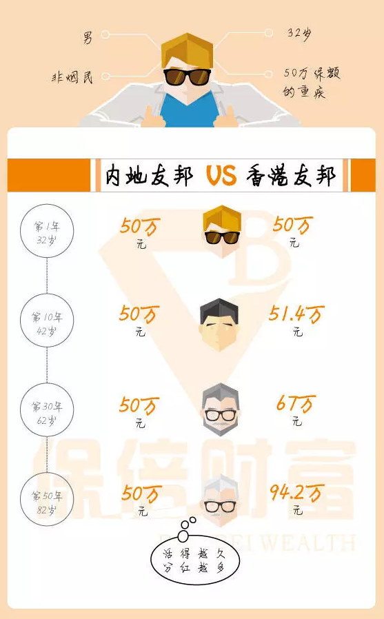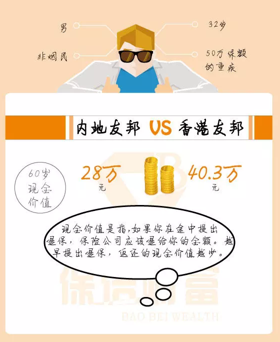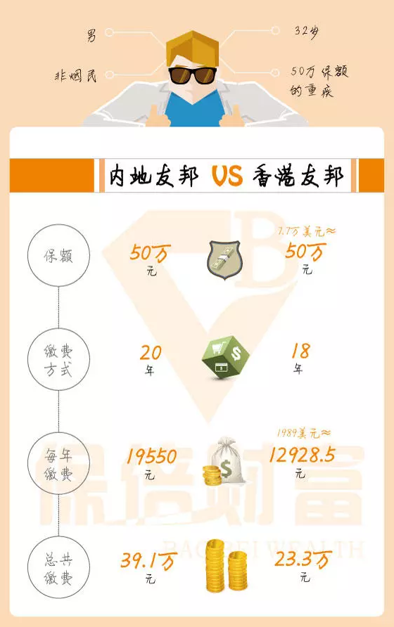 例如,被保險人是一名32歲的非吸煙男子,他想要支付50萬保額的嚴重疾病。他對友邦非常有信心并且最初準備在內地投保,但是一位朋友告訴他購買香港保險。便宜! 香港友邦相同的保額,保障更高,保費更低。