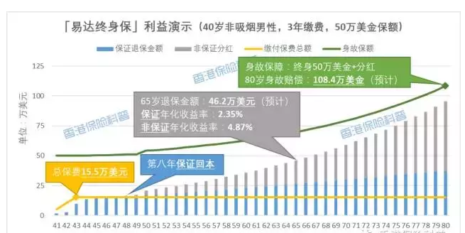 讓我們舉一個(gè)例子來看看「易達(dá)終身保」如何提供一個(gè)帶有保單的“身故保障 +養(yǎng)老儲(chǔ)蓄+財(cái)富繼承”三種功效的。以下是該計(jì)劃的好處的示范(例如,一名40歲的非吸煙男子,死亡保額為0萬美元,3年繳費(fèi),每年5175美元,以及總共保費(fèi),三年約155,000美元):