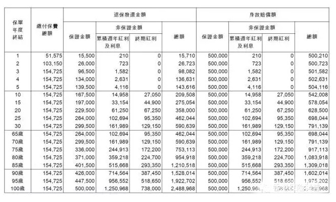 如果被保險(xiǎn)人選擇在65歲時(shí)退保,則預(yù)期的退保金額為462,000美元(約為總保費(fèi)的3倍),25年的年化收益率由此金額計(jì)算,保證年份為保單??傻帽蔚氖找媛蕿?.35%,非保證年化收益率為4.87%(功能2:養(yǎng)老儲(chǔ)蓄);