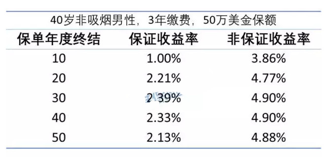 此外,上述收益沒有考慮到500,000美元壽險(xiǎn)保額的風(fēng)險(xiǎn)和成本。通常,我們購買的純儲(chǔ)蓄產(chǎn)品都沒有死亡保障(即死亡補(bǔ)償=累計(jì)保費(fèi))。除了提供節(jié)省之外,「易達(dá)終身保」還提供了500,000美元的終身死亡保障,這相當(dāng)于將保險(xiǎn)人節(jié)省了一份定期壽險(xiǎn)的保費(fèi),而這部分成本也應(yīng)該包含在我們的保單收入中。如果我們將600,000美元的保額、20年平均值保費(fèi)定期壽險(xiǎn)添加到保單,則定期壽險(xiǎn)每年消耗905美元保費(fèi),即總保費(fèi)155,000美元的0.58%(= 905 / 155,000),這相當(dāng)于產(chǎn)品的真正的保證收益率與非保證產(chǎn)量將增加至少0.58%(用“至少”一詞表示,是考慮到產(chǎn)品提供的終身壽險(xiǎn)值超過定期壽險(xiǎn))。