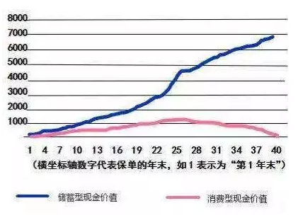 為了找出現(xiàn)金價(jià)值的走勢(shì),我們使用儲(chǔ)蓄類終身壽險(xiǎn)和消費(fèi)類定期壽險(xiǎn)作為例子。
